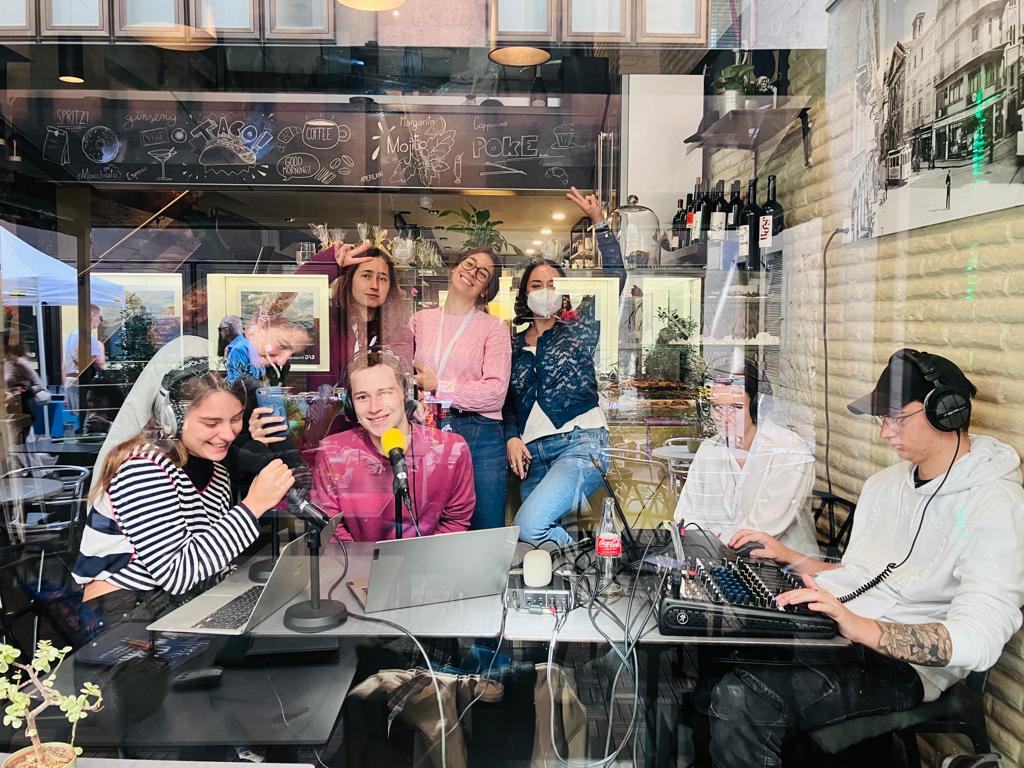All postazione radiofonica al Bar Portici di Lugano: